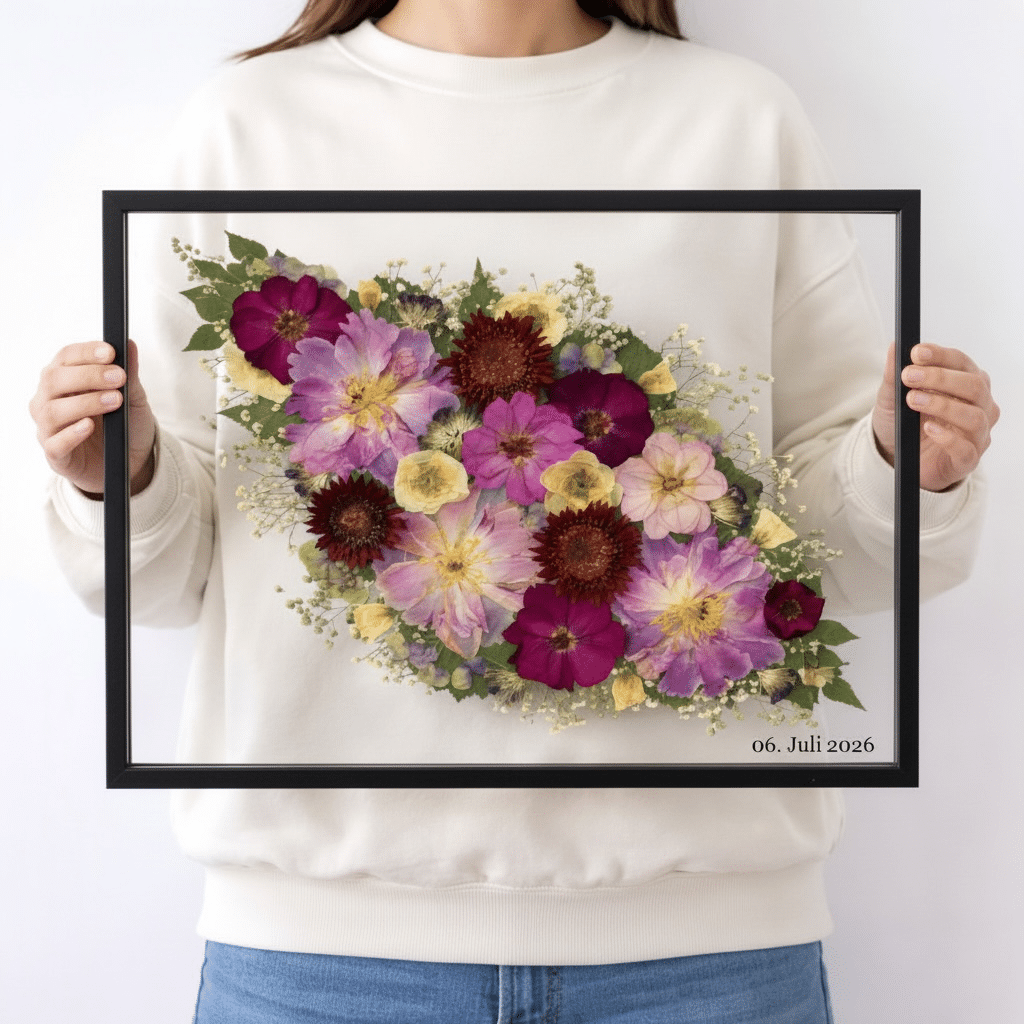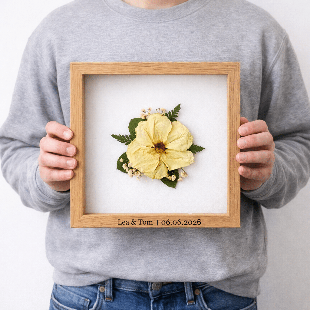 ✨ Mach dein Erinnerungsstück einzigartig ✨ Jedes unserer Kunstwerke kann mit einer individuellen Personalisierung zu etwas ganz Besonderem werden. Ob zarte Initialen, euer Hochzeitsdatum oder eure Namen wir gestalten dein Bild ganz nach deinem Wunsch. Die Personalisierung kann direkt im Bild integriert oder elegant auf dem Rahmen verewigt werden dezent, edel und genau so, wie es zu euch passt. So entsteht ein Unikat, das nicht nur euren Brautstrauß, sondern auch eure Geschichte für immer festhält.